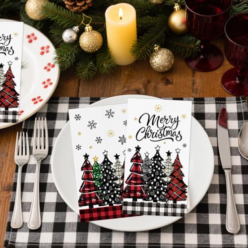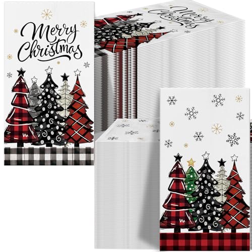 100 Pack Christmas Paper Napkins, Disposable Holiday Guest Towels, Red & Black Plaid Tree Dinner Napkins for Christmas Parties, Table Dinner Bathroom