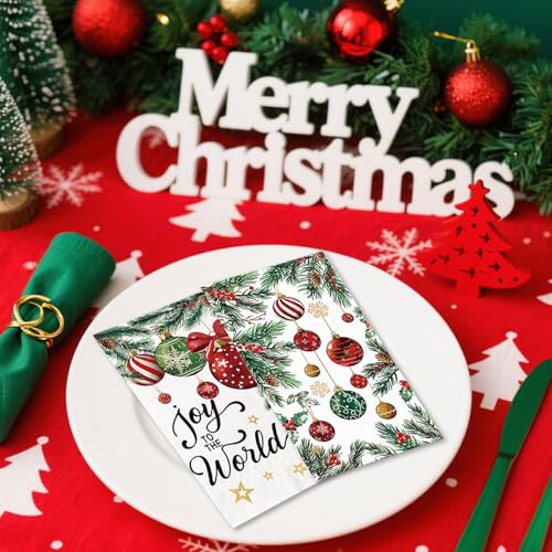 Festive Design: These Christmas napkins feature several colorful Christmas ornaments hanging from evergreen branches. The ornaments come in various shapes, sizes, and colors. Pinecones, holly leaves with red berries, and snowflake decorations are arranged among the greenery, creating a cozy and celebratory holiday vibe