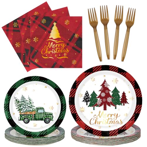 Christmas Plates Set: You will receive 25 x 9 inch pink paper plates, 25 x 7 inch pink dessert plates, 25 x 6.5 inch pink paper napkins, 25 plastic forks.Our Christmas paper plates and napkins set that can serve 25 guests at the same time.