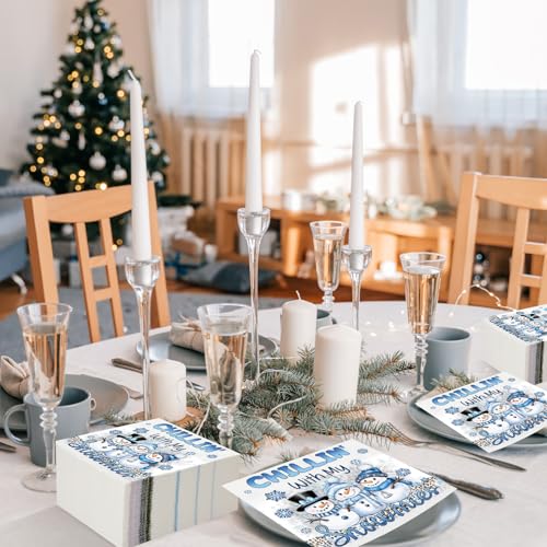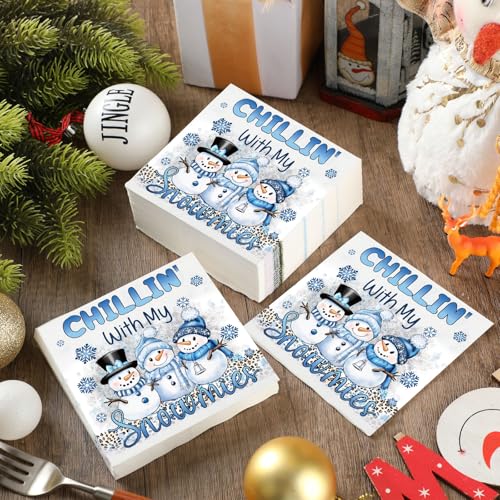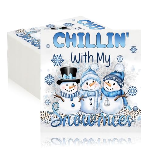 Charming Winter Design: elevate your Christmas party atmosphere with these winter guest napkins featuring playful snowmen, intricate snowflakes, and the phrase « Chillin with My Snowmies »; These designs add a cozy, cheerful touch to any festive