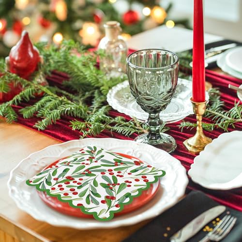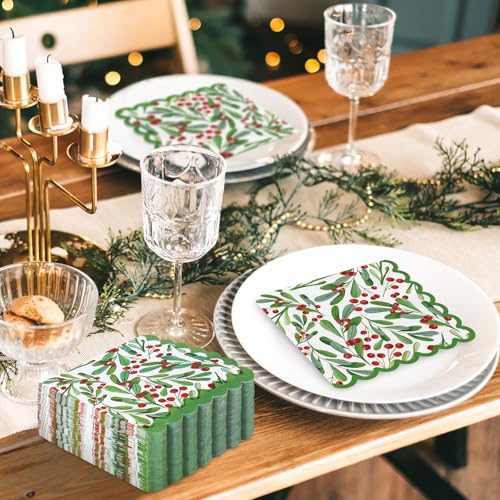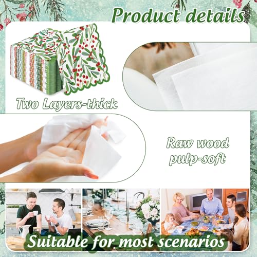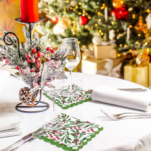 FESTIVE DESIGN: Our napkins designed with scalloped edge and feature watercolor holly and berry motifs, mainly colored in festive green and red, exquisite and fresh, adding a glance of refinement and beauty to your Christmas tableware decor