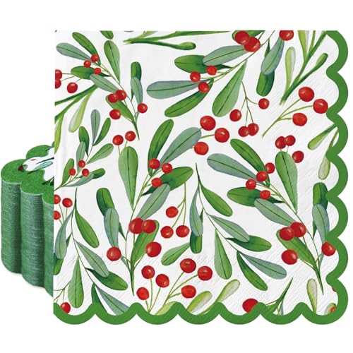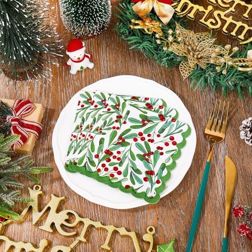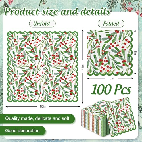 100Pcs Christmas Cocktail Beverage Napkins Disposable Xmas Holly Berry Scalloped Paper Napkin Decorative Dessert Hand Napkins for Party Supplies Tableware Decor