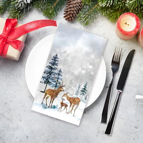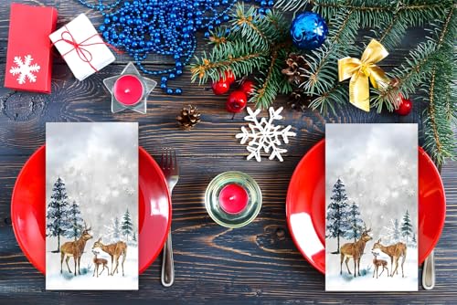 TIMELESS HOLIDAY CHEER: Our Christmas dinner napkins feature classic designs like reindeer, snowflakes and xmas tree, instantly spreading festive charm. Ideal for creating a warm, inviting atmosphere at dinner tables, buffets, or holiday décor displays