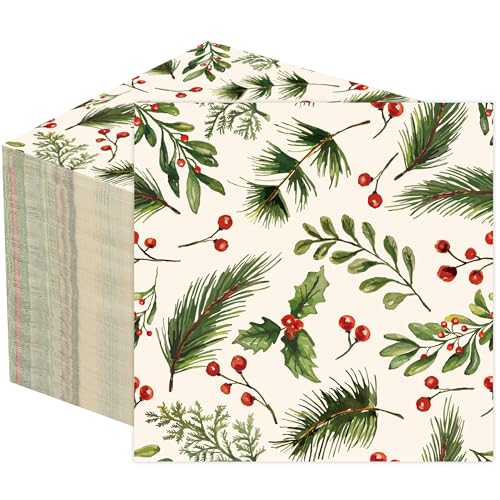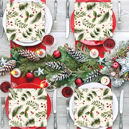 100PCS Christmas Holly Cocktail Napkins 5″ X 5″ Holly Berries and Pine Paper Napkins Xmas 3-Ply Disposable Beverage Napkins for Holiday Christmas Events Dining Kitchen Tableware Party Supplies
