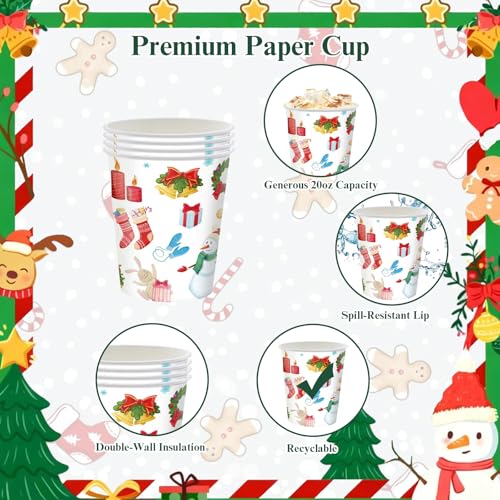 Introducing our 125PCS Christmas plates disposable set, a practical choice for holiday gatherings. The set includes 25 9-inch Christmas tree plates (ideal for main dishes like roasted turkey or ham), 25 7-inch « Merry Christmas » dessert plates (perfect for cookies, cakes, or fruit), 25 6.5-inch festive napkins, 25 20oz paper cups and 25 forks—enough to serve up to 25 guests, fitting needs for christmas party supplies.