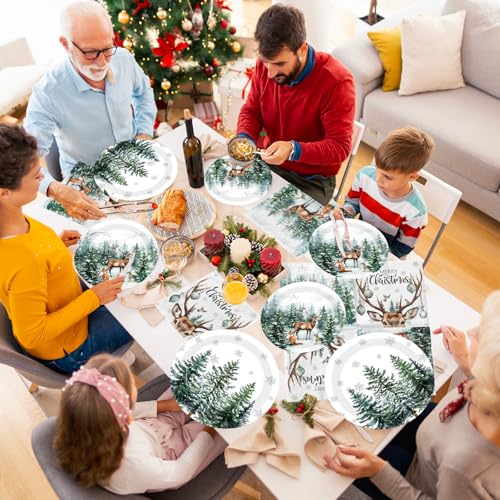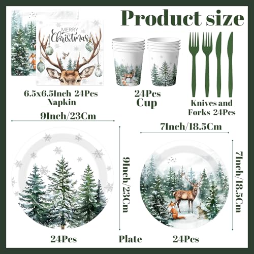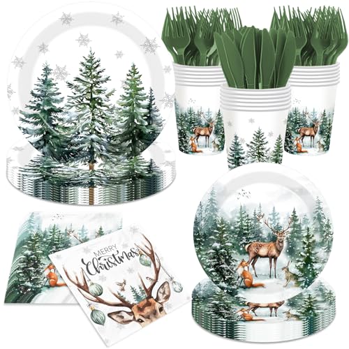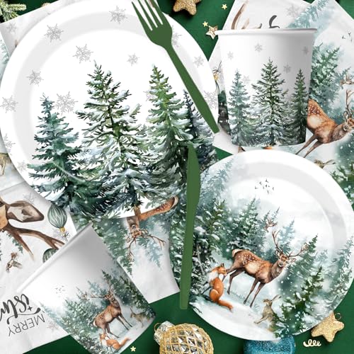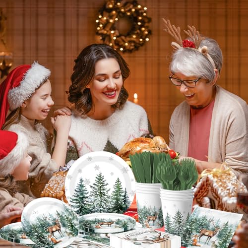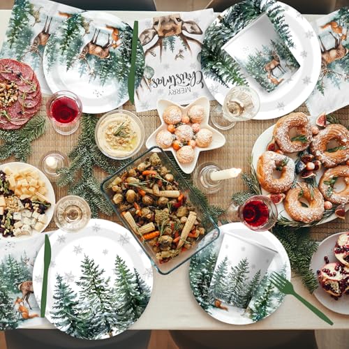 144 Pcs Christmas Plates and Napkins Christmas Party Supplies Dinnerware Set Including Watercolor Pine Deer Plates Napkins Cups Forks Knives for Winter Holiday Decor Serves 24 Guests