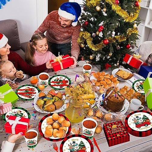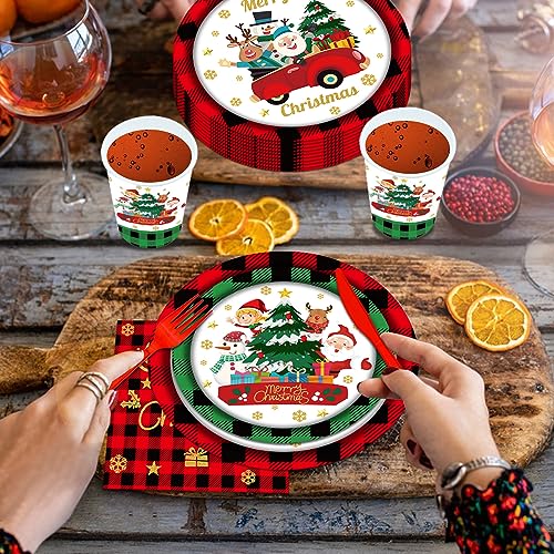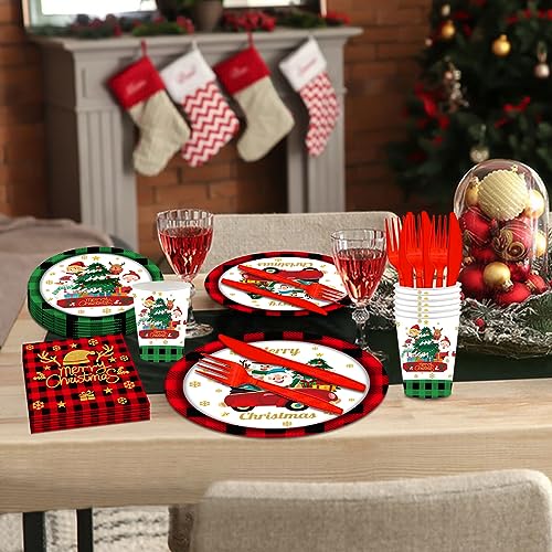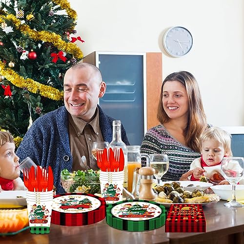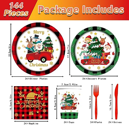 144Pcs Christmas Party Supplies, Christmas Plates and Napkins Set for 24 Guests, Merry Christmas Party Tableware Set for Buffalo Plaid Xmas Party Supplies Santa Christmas Dinner Party Decorations