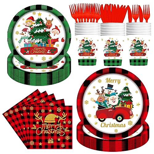 CHRISTMAS PARTY SUPPLIES SERVE 24: Our Christmas tableware set have 144 pieces, including 24 x Christmas dinner plates (9 inch), 24 x Christmas dessert plates (7 inch), 24 x black and red plaid napkins , 24 x cups, 24 x cutlery (forks), 24 x knives. Add more fun to your Christmas party and let your friends and family have a great time with a unique red and green with a Christmas style party!