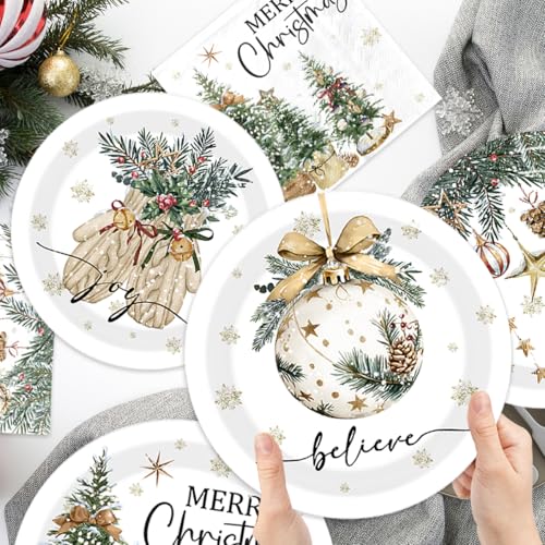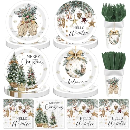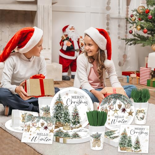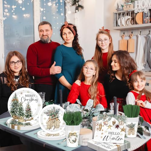 144Pcs Merry Christmas Paper Plates and Napkins -Snowflake Christmas Tree Bell Dinnerware Set for Hello Winter Holiday Xmas Party Supplies