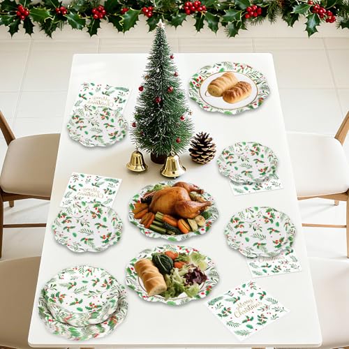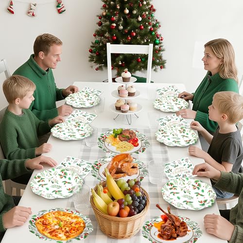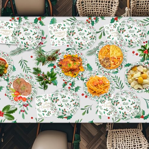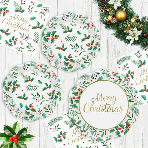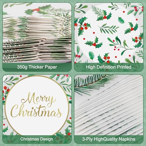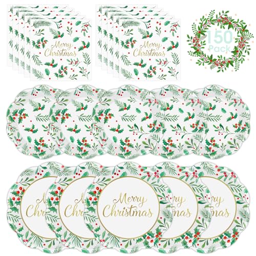 150 Pcs Merry Christmas Plates and Napkins – Disposable Christmas Paper Plates and Napkins, Holly Leaves Red Berries Tableware Sets for Winter Xmas Party Table Decorations Supplies Favors, Serve 50