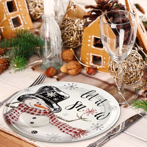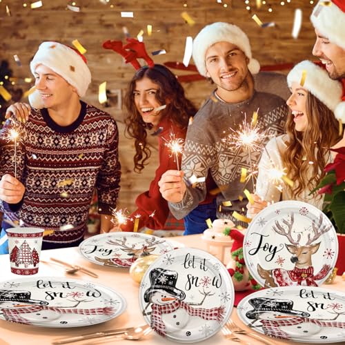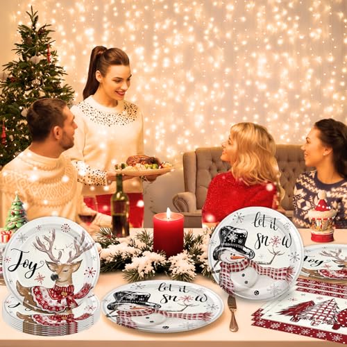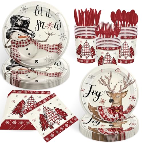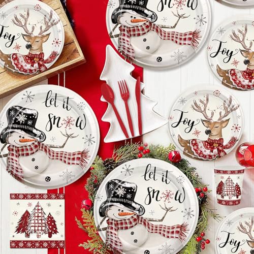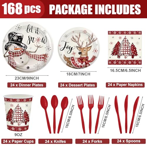 168PCS Christmas Snowman Party Supplies Winter Holiday Let It Snow Party Decorations Red Watercolor Xmas Pine Deer Tableware Paper Plate Cup Napkin Forks Knives Serves 24