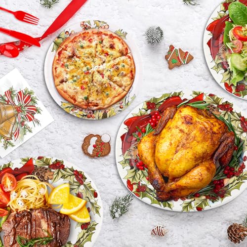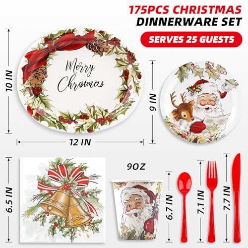 175Pcs Christmas Paper Plates Set – (25 Guests) with 10 * 12inch Oval Plates and 9inch Paper Plates,Napkins,Cups, Forks,Knives,Spoons for Christmas Party Supplies