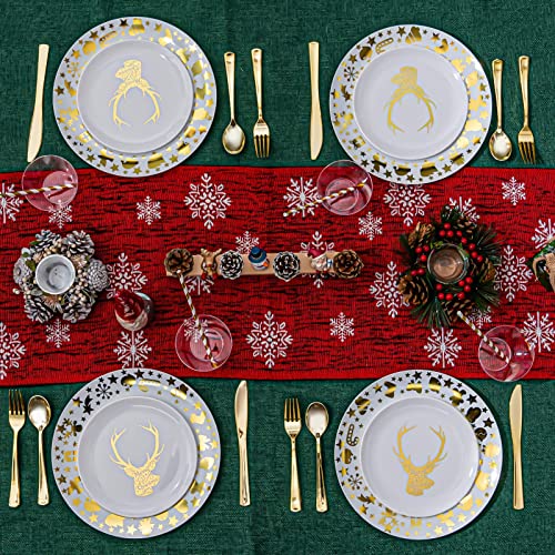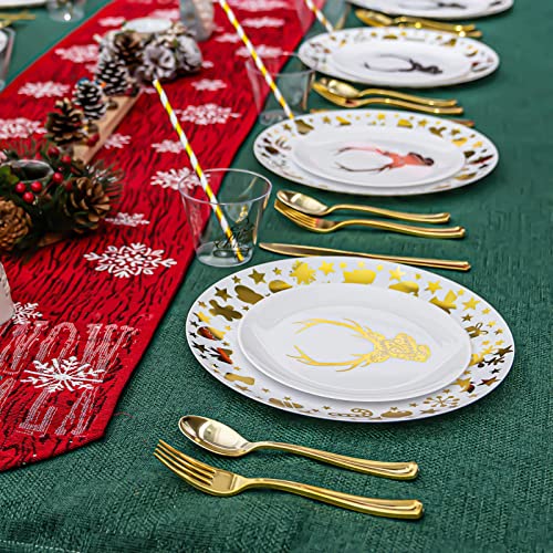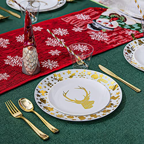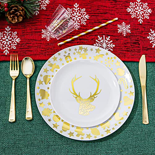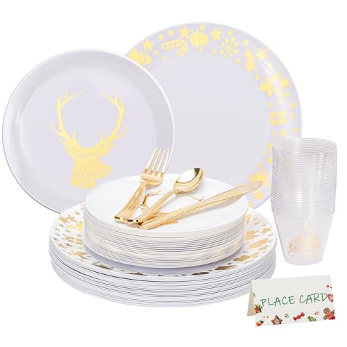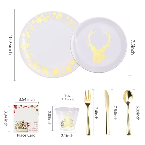 175pcs Christmas Plastic Dinnerware Set for 25 Guests-25 10.25″ White and Gold Disposable Christmas Plates, 25 7.5″ Gold Elk Dessert Plates, 75 Silverware Set, 25 Cups and 25 Table Cards