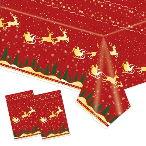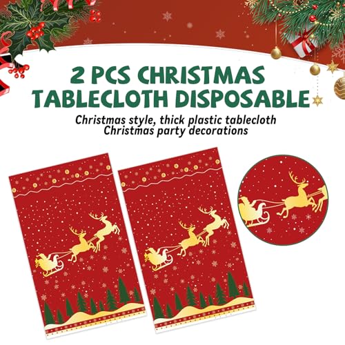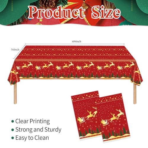 2 Pcs Christmas Tablecloth Disposable 54×108 Inch, Red Xmas Tree Reindeer Plastic Table Cloth Rectangle Table Cover for Winter Theme Holiday Christmas Party Decoration