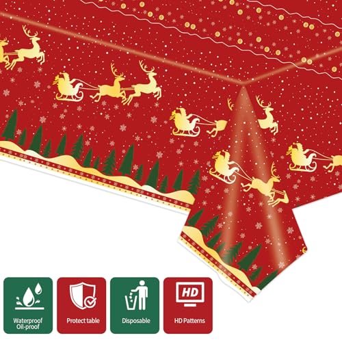 Ideal Size for Festive Tables: Our Christmas plastic tablecloths measure approximately 54 x 108 inches, easily covering 8-foot tables. Features charming prints of snowflakes, Santa Claus, and reindeer in rich red, green, and gold tones for a truly festive look.