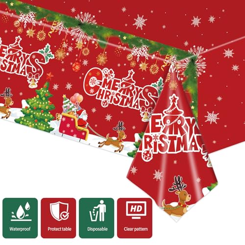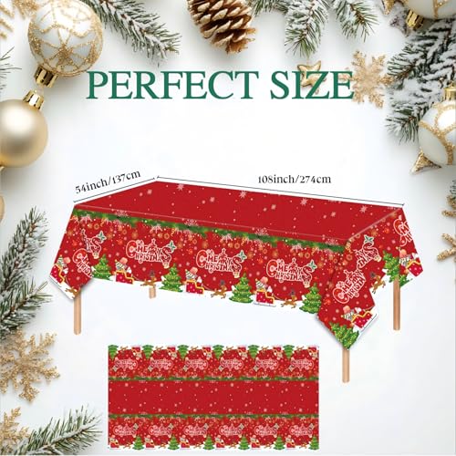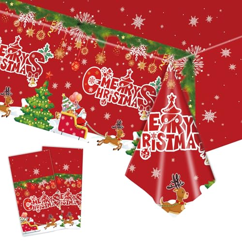 2 PCS Red Christmas Tablecloth – Disposable Snowflake Tablecloth Santa Claus Reindeer Table Cover for Merry Christmas Holiday Party Supplies (54×108 Inch)