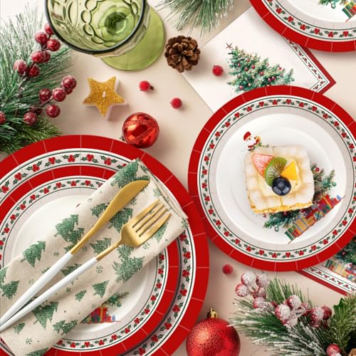 Complete Christmas Party Supplies Set: Christmas themed birthday party supplies package contains 50 x 9-inch paper dinner plates, 50 x 7-inch paper dessert plates, and 100 x paper napkins (6.5in x 6.5in folded). Add a warm and joyful Christmas atmosphere to your party, so that every guest can feel the happiness and magic of the holiday season. Perfect as Christmas gifts, holiday gifts, or festive gift ideas for family gatherings and friends’ celebrations