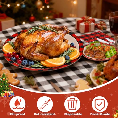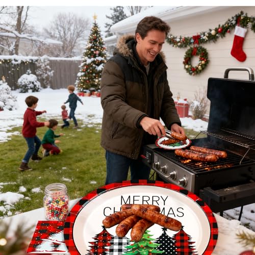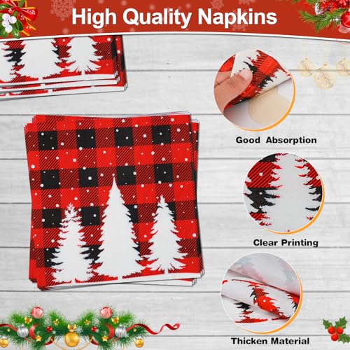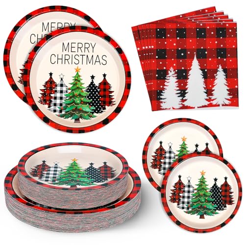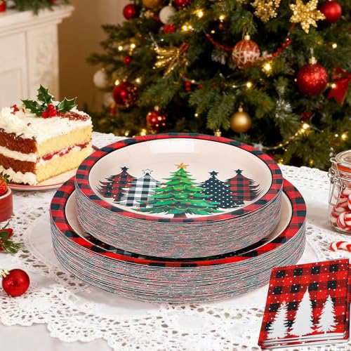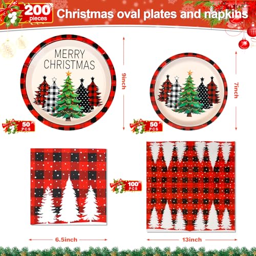200Pcs Christmas Paper Plates and Napkins Sets, Disposable Buffalo Plaid Christmas Tree Plates and Napkins for Winter Xmas Party Supplies