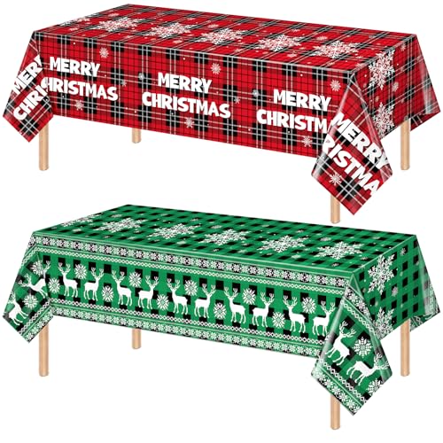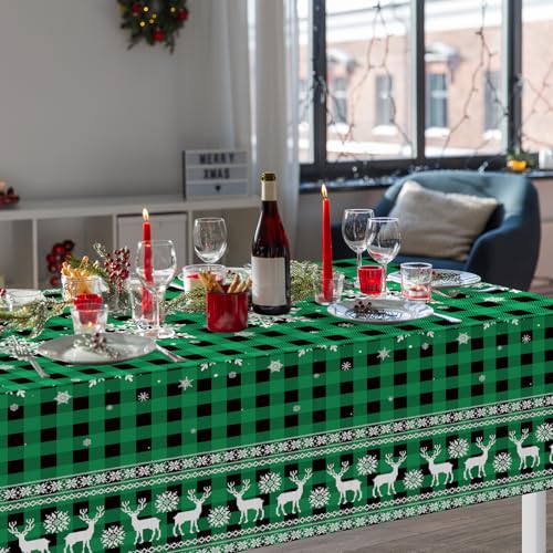 Add instant holiday charm to any dining space with two vibrant plaid christmas tablecloth designs featuring classic snowflakes and reindeer patterns.