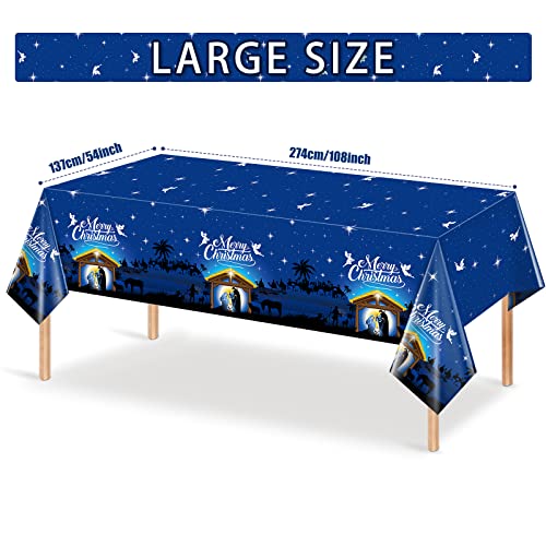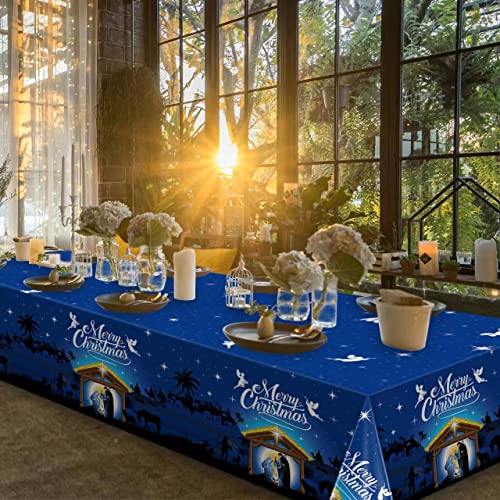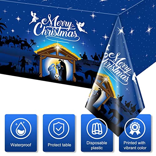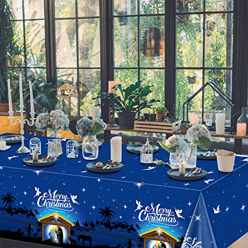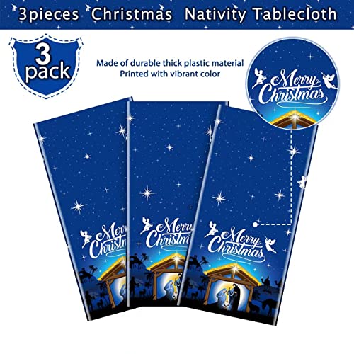 3 Pcs Holy Nativity Christmas Tablecloth, Blue Merry Christmas Religious Plastic Table Cover Holy Night Nativity Tablecloth for Merry Christmas Jesus Nativity Religious Party Decorations, 54×108 Inch