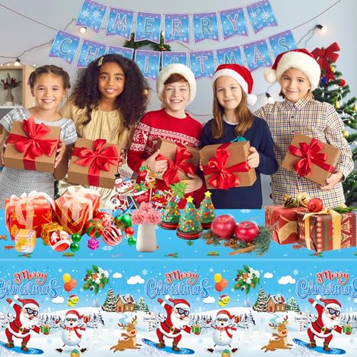 3 Pcs Merry Christmas Tablecloth – Xmas Cool Santa Claus Plastic Table Cloth Disposable Rectangular Blue White Table Covers for Christmas Tables Decorations Party Supplies Decor, 108 x 54 Inch