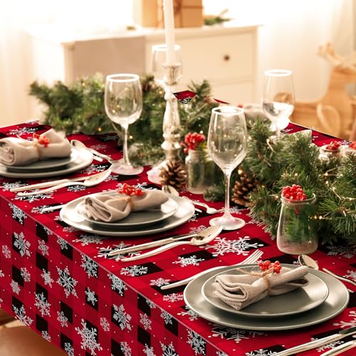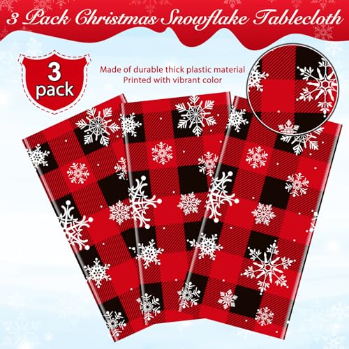 What will you receive:3 pieces rectangular Christmas party tablecloth,all over printed with white snowflake partterns on bright red and black buffalo plaid backdrop,ideal for decorating your winter Christmas holiday party supplies and decorations