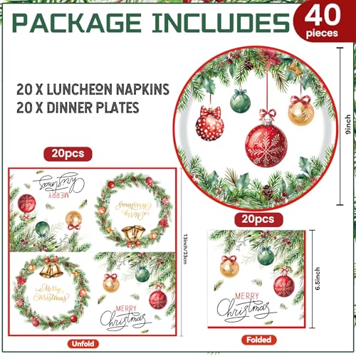 40Pcs Christmas Paper Plates and Napkins Party Supplies, Disposable Christmas Ball Party Plates Napkins Dinnerware Set for Winter Holiday Theme Xmas Table Decorations