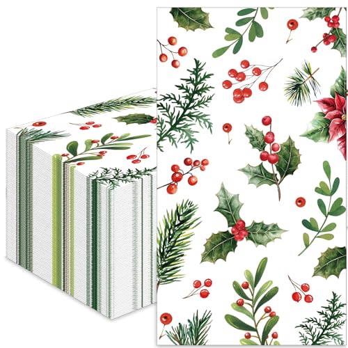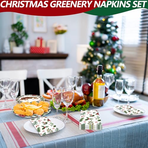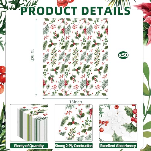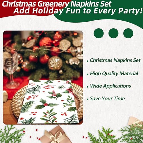 50 Count Christmas Greenery Paper Napkins – Disposable Holiday Cocktail Napkins with Holly, Pine, Berries, and Poinsettia Design for Xmas Dinner, Winter Seasonal Gatherings and Table Decorations