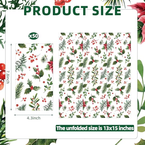 PACK OF 50 | CHRISTMAS GREENERY NAPKINS – This set includes 50 disposable 2-ply paper napkins with festive holly leaves, pine branches, red berries, poinsettias, and greenery. Each napkin measures 13 x 15 inches unfolded and 7.8 x 4.3 inches folded—perfect for drinks, appetizers, and desserts at your holiday gatherings.