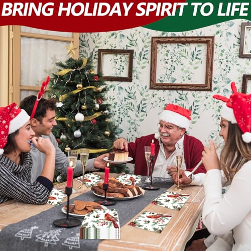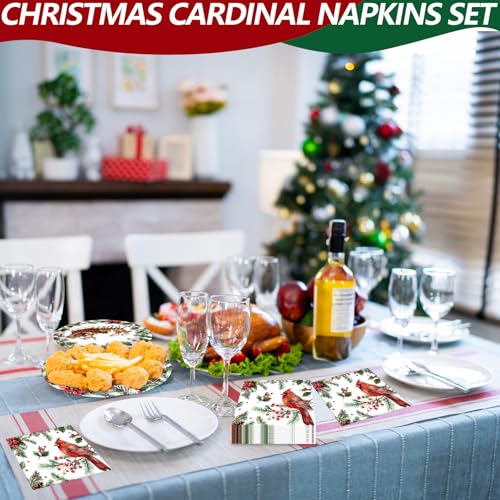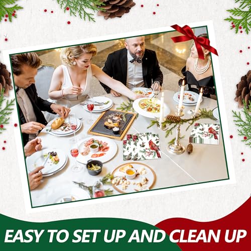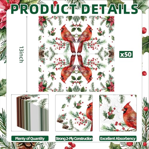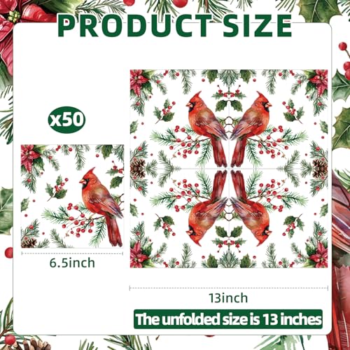 50 Count Christmas Paper Napkins, Disposable Holiday Cocktail Napkins with Cardinal, Holly, and Pine Design for Winter Parties, Xmas Dinner, Rustic Wedding, New Year, and Festive Table Decorations