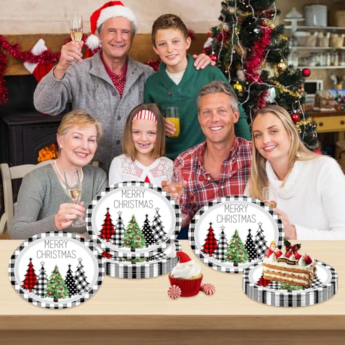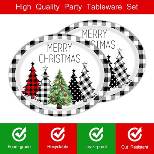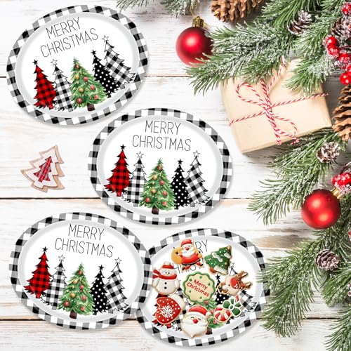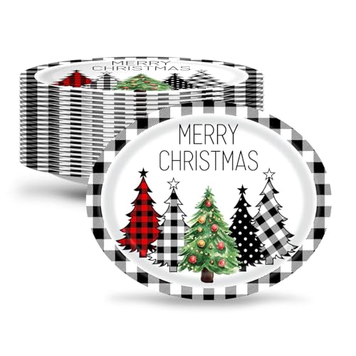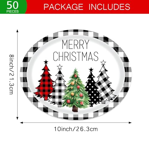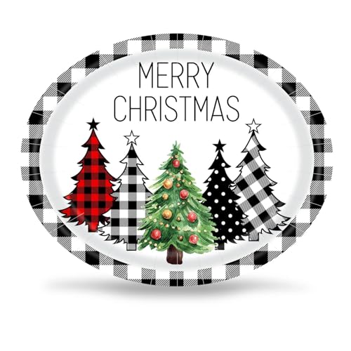 50 PCS Buffalo Plaid Christmas Tree Party Oval Paper Plates – Large 12in Platters Tableware Supplies – Disposable Dinner Plates for Christmas Party Holiday