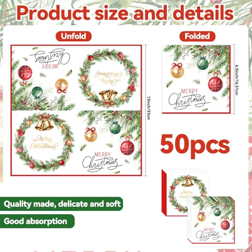 Elegant Christmas Napkins: Set includes 50 vibrant Christma paper napkins, perfect for adding festive flair to your party. Each napkin measures 6.5 x 6.5 inches folded (opens to 13 x 13 inches), perfect for all your holiday events, from large family feasts to intimate cozy celebrations.