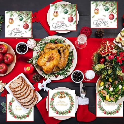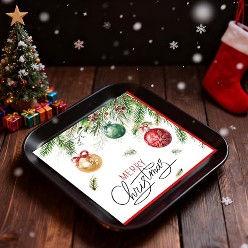 50 Pcs Christmas Paper Napkins 13 x 13 Inches, Disposable Luncheon Dinner Party Napkins Xmas Balls Wreath Theme for Winter Holiday Christmas Party Decorations