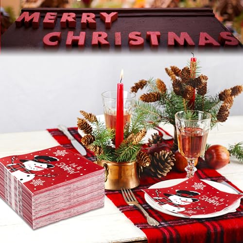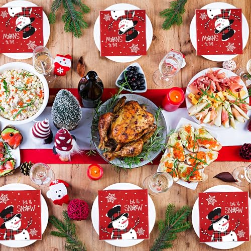 Christmas Decoration: our let it snow paper napkins feature with classic Christmas elements, such as cute snowman wearing red and black buffalo scarf and hat, flying snowflakes and « Let it Snow » words; bright red background match the Christmas theme and create a dynamic feeling.