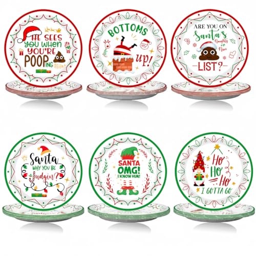 60 PCS Funny Christmas Paper Plates 7 Inch Red and Green Santa I Know Him Funny Xmas Disposable Round Tableware Dessert Plates for Novelty Christmas Theme Party decor, 6 styles