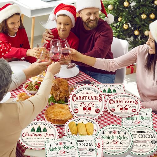 Vintage Christmas Party Supplies: The package includes 20pcs-9inch dinner plates, 20pcs-7inch dessert plates, 20pcs-napkins, with napkin sizes of 6.5×6.5 inches (folded) and 13×13 inches (unfolded). The quantity is sufficient and the style is exquisite.