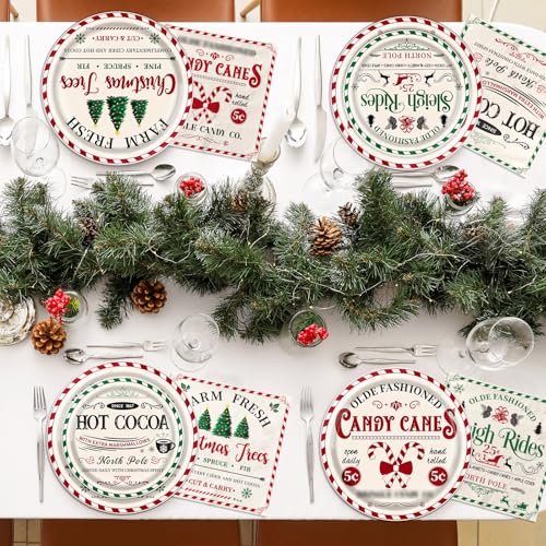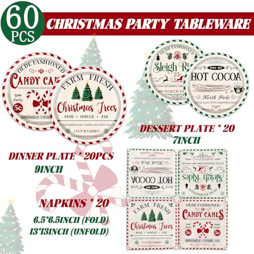 60Pcs Vintage Christmas Party Decorations,Christmas Party Plates and Napkins Retro Xmas Text Hot Cocoa Xmas Tree Tableware for Winter Holiday Party Serve 20