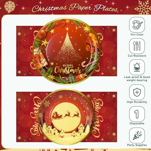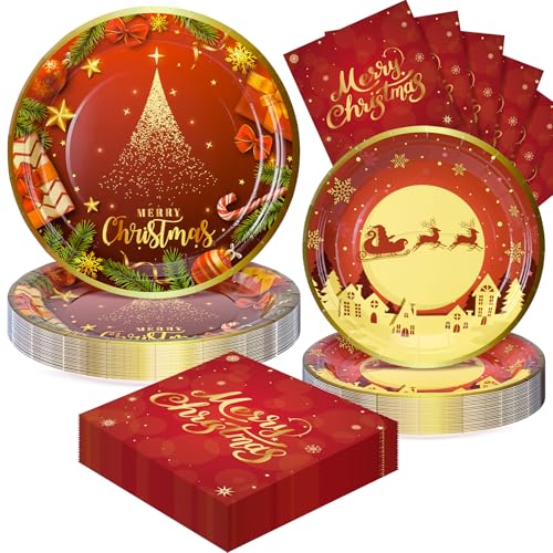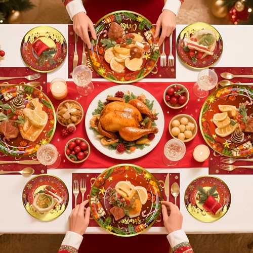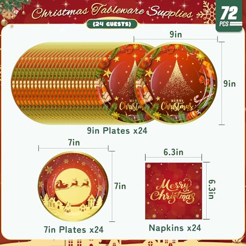 Christmas Party Supplies: Total 72PCS – Serves 24 guests. 7in Christmas Plates x24 9in Christmas Plates x24 Christmas Napkins x24
