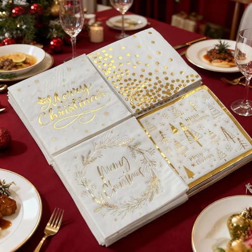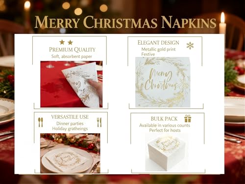Unique Christmas Guest Napkins: made from premium paper, Shinning gold foil « Merry Christmas » for Christmas dinner party and holiday.