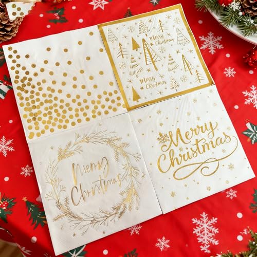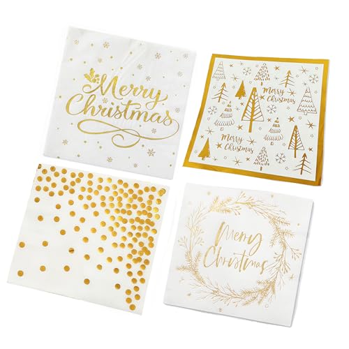 80-Count 6.5 Inches Gold and White Chrismas Cocktail Napkins Disposable- 4 Assorted Designs