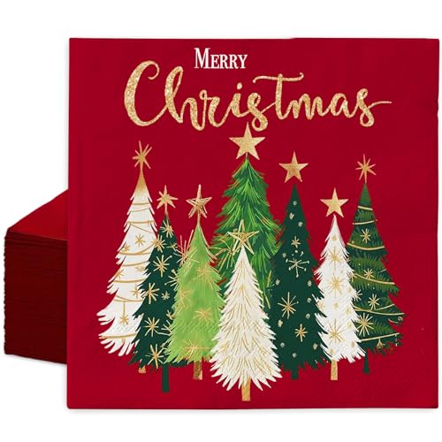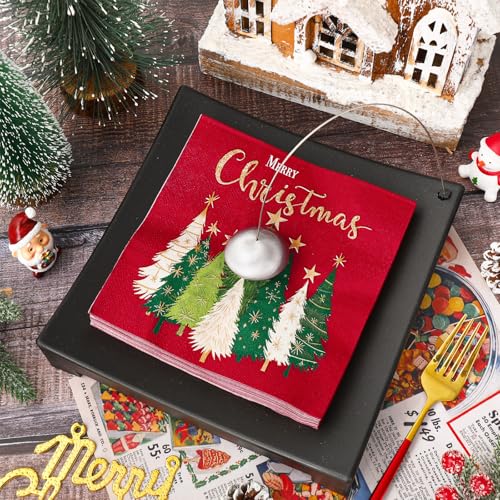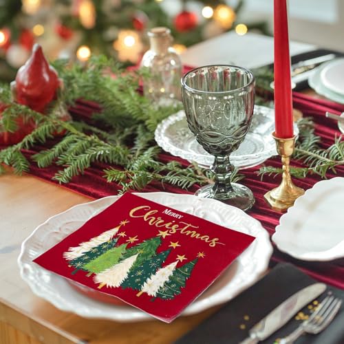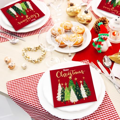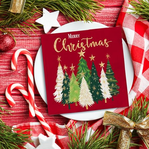GOLD FOIL DESIGN: Our paper napkins adopt gold foil design with stars, pine trees and words of merry Christmas in red background, funny and delicate, will nicely increase festive atmosphere