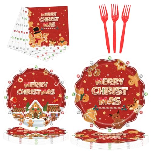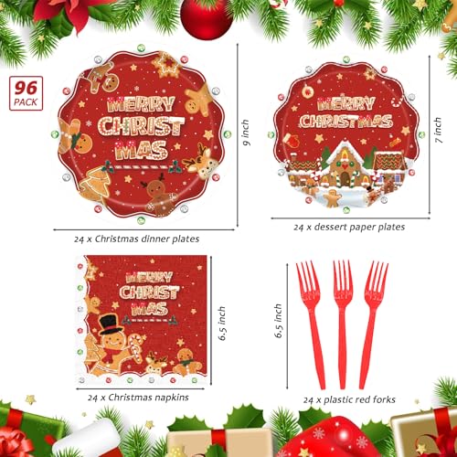【GINGERBREAD MAN TABLEWARE SET】Christmas gingerbread house party supplies set includes 24 x 9″ dinner paper plates, 24 x 7″ dessert paper plates, 24 x 6.5″ napkins, 24 sets of red forks. Available for 24 guests, which are perfect for your Christmas gingerbread house party decorations