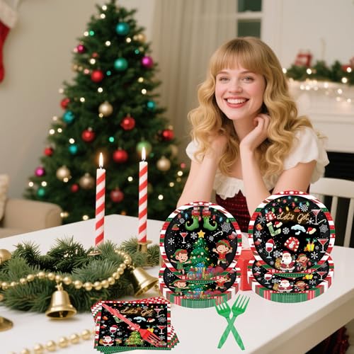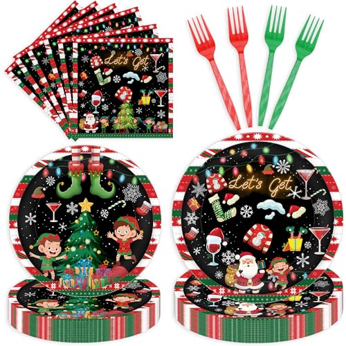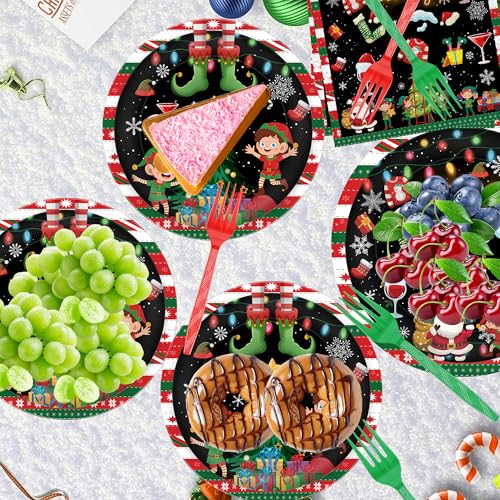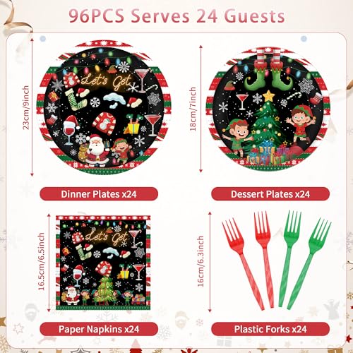 96 Pcs Lets Get Elfed Up Christmas Party Decorations, Festive Elf Santa Plates Napkins Forks for 24 Guests, Funny Holiday Tableware Set Party Supplies