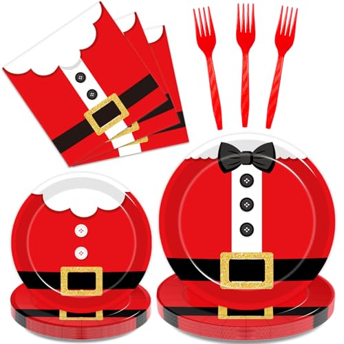 CHRISTMAS PARTY: For each Christmas Santa clause suit print party supplies set, you will receive 24 dinner plates (9’’), 24 dessert plates (7’’), 24 napkins (13’’), and 24 forks(6.5’’). The Santa Claus party supplies set are perfect gifts and the perfect complement to your merry Christmas party decorations