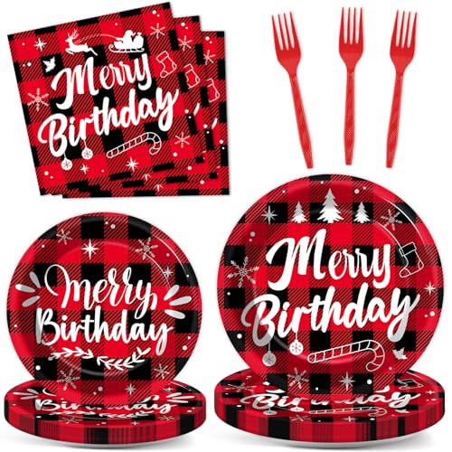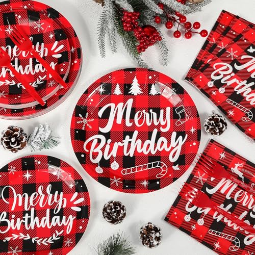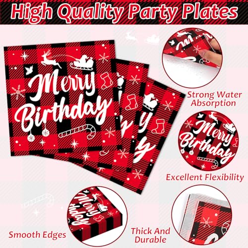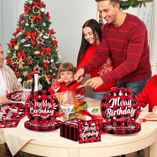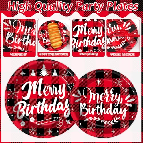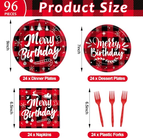 96Pcs Merry Christmas Birthday Paper Plates and Napkins Disposable Red Black Buffalo Plaid Tableware Set for Christmas Birthday Party Supplies Holiday Baby Shower Table Decorations Serves 24
