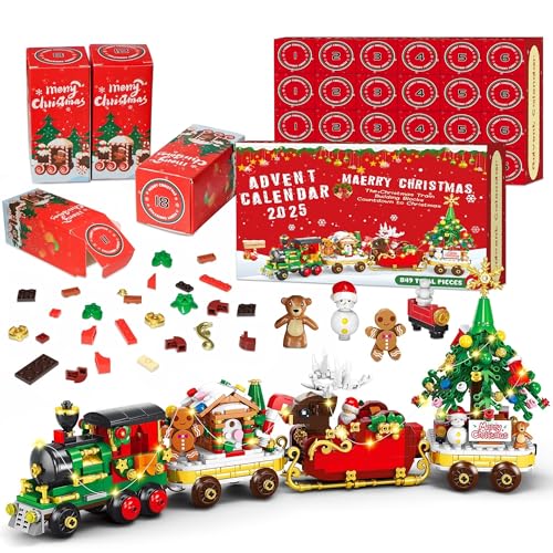 Advent Calendar 2025 Christmas Train Building Set with Lights, 24 Boxes Christmas Countdown Surprise Blocks Compatible with Lego, Xmas Gifts for Kids Adults (849PCS)