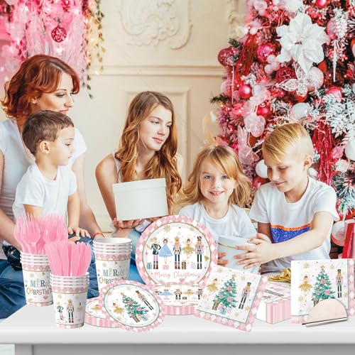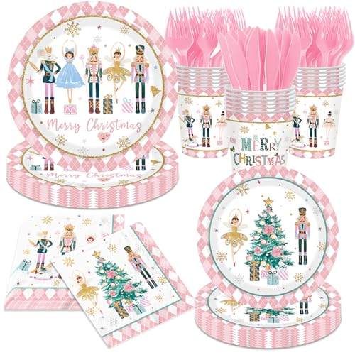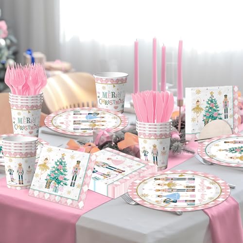 Christmas Party Tableware Decorations,144pcs Pink Christmas Paper Plates and Napkins,Cups,Forks and Knives Xmas Paper Dinnerware for Winter Holiday Party Supplies
