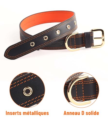 Ferrures Robustes : Nos collier pour chien en cuir sont équipés d’œillets en métal pour éviter les déchirures. Ils disposent de boucles en métal solides et d’anneaux en D qui garantissent une fixation sécurisée pour une laisse ou des médailles d’identification.