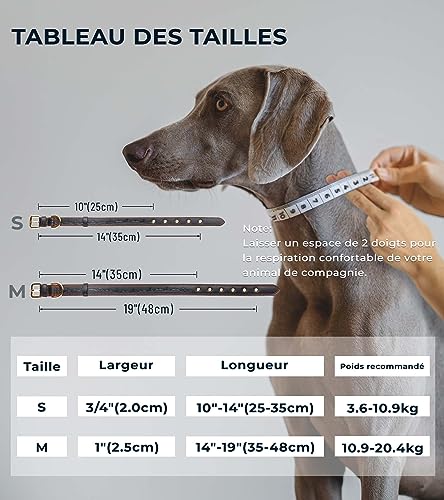 Ajustable : Ce collier cuir chien est conçu pour s’adapter aux tours de cou de 35 cm à 48 cm et est recommandé pour les chiens de petite à moyenne taille pesant entre 24 et 45 livres (10,9 – 20,4 kg).