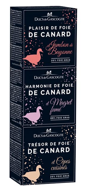 Ce coffret cadeau comprend : Harmonie de foie de canard et magret fumé (20% foie gras) 65g, Plaisir de foie de canard et jambon de Bayonne (20% foie gras) 65g, Trésor de foie de canard et cèpes cuisinés (20% foie gras) 65g